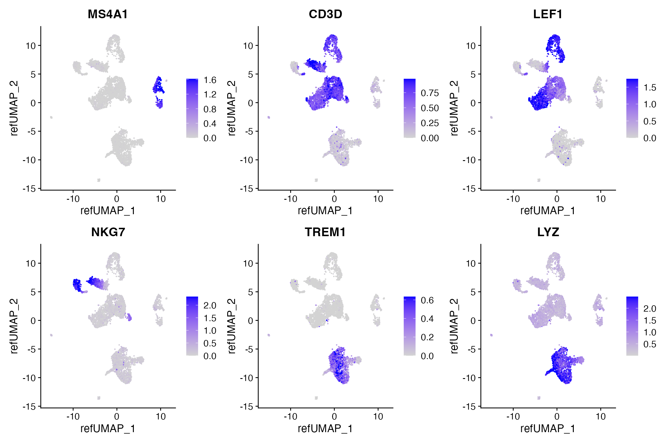 features = c('MS4A1', 'CD3D', 'LEF1', 'NKG7', 'TREM1', 'LYZ'),