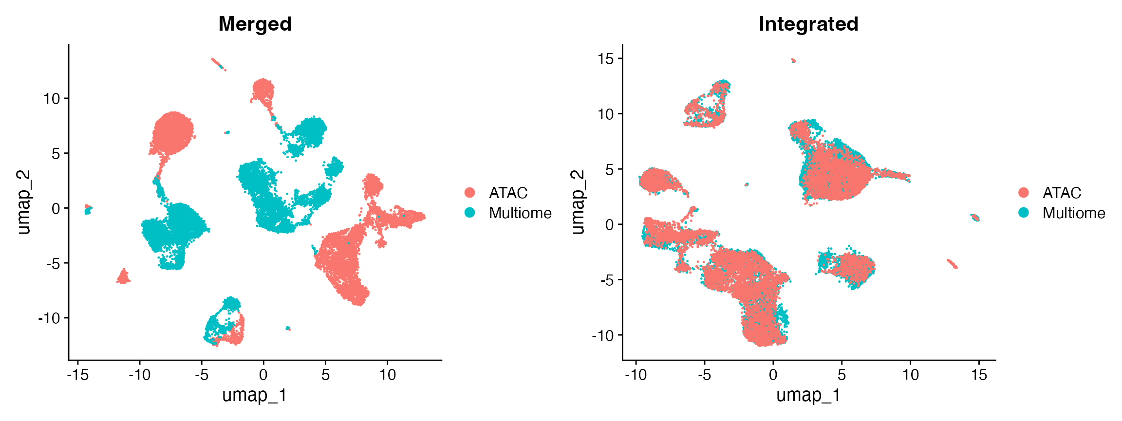 integrate_atac.RmdHere we demonstrate the integration of multiple single-cell chromatin datasets derived from human PBMCs. One dataset was generated using the 10x Genomics multiome technology, and includes DNA accessibility and gene expression information for each cell. The other dataset was profiled using 10x Genomics scATAC-seq, and includes DNA accessibility data only.