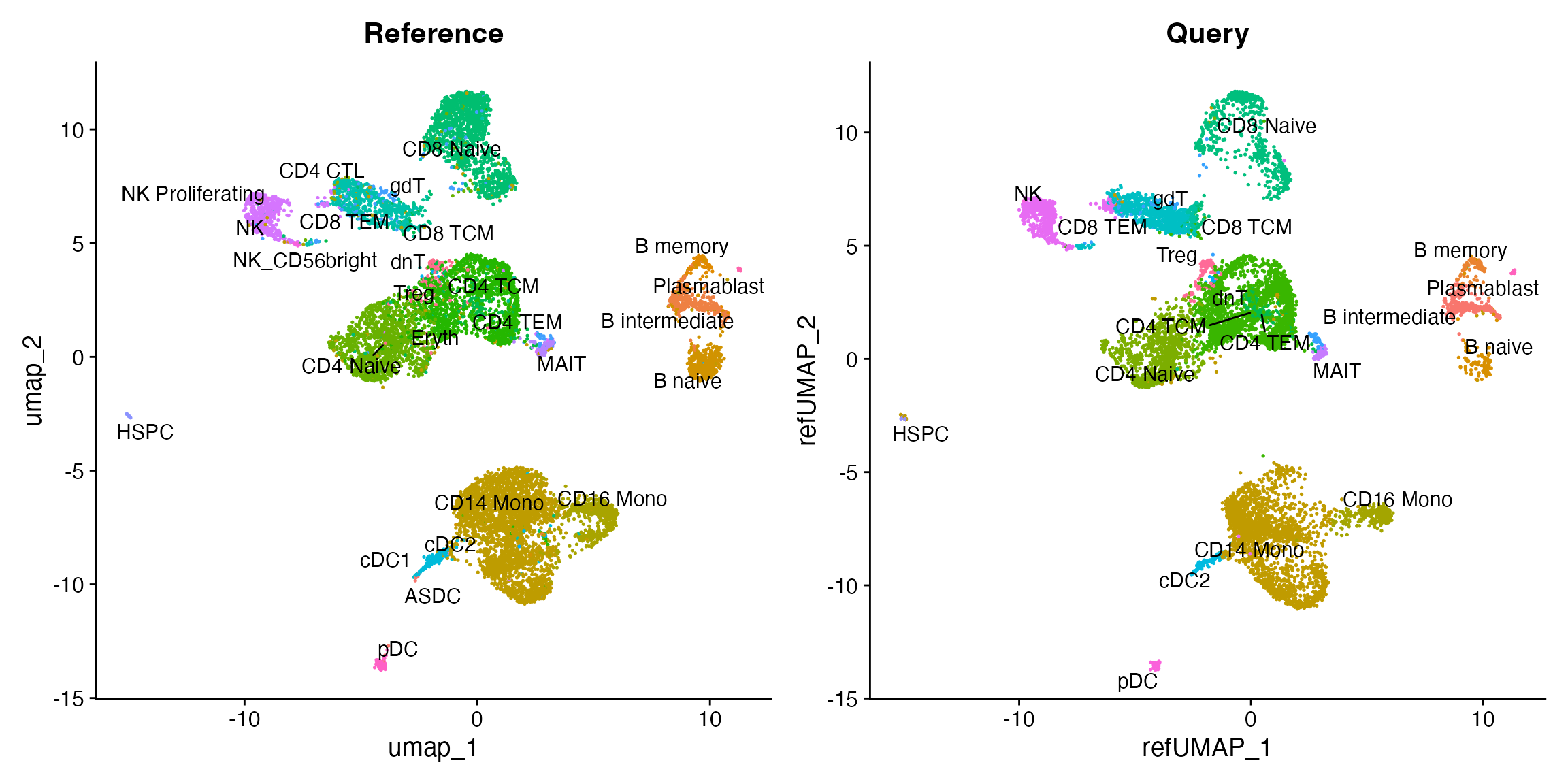 reference mapping results and the cell type labels now associated with