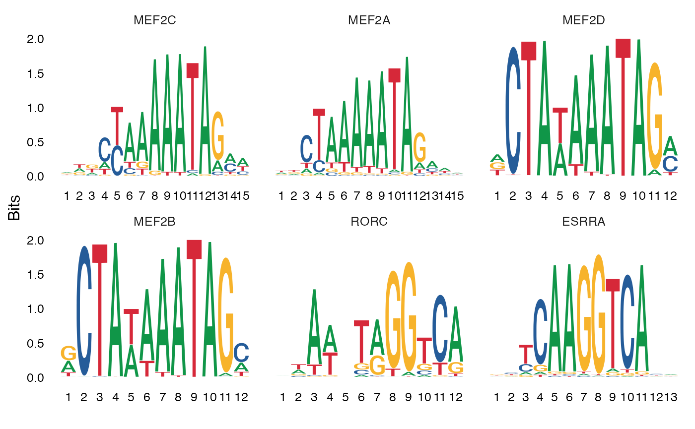 We can also plot the position weight matrices for the motifs, so we can visualize the different motif sequences.