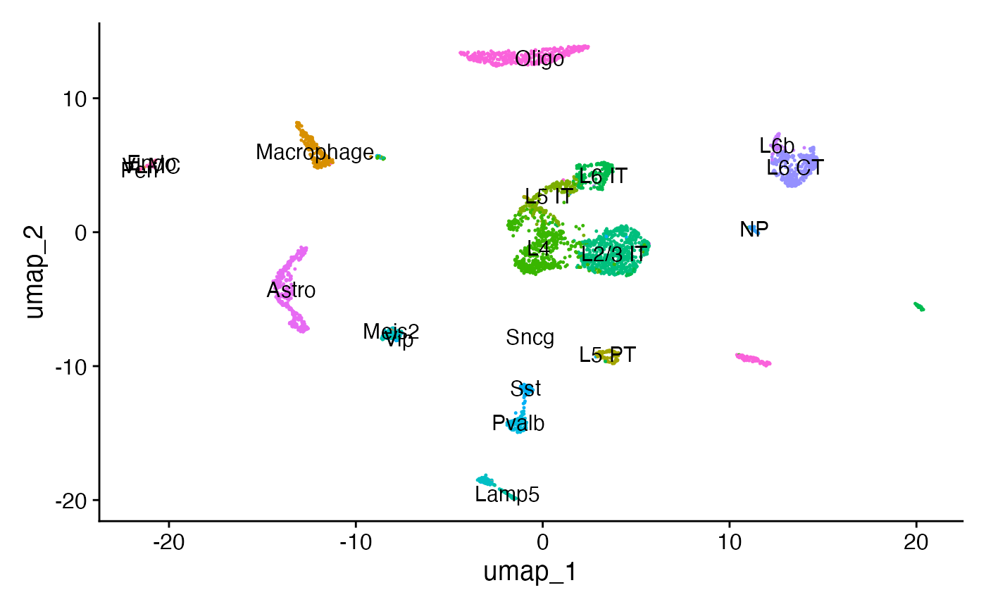 In this demonstration we use data from the adult mouse brain. See our vignette for the code used to generate this object, and links to the raw data. First, load the required packages and the pre-computed Seurat object: