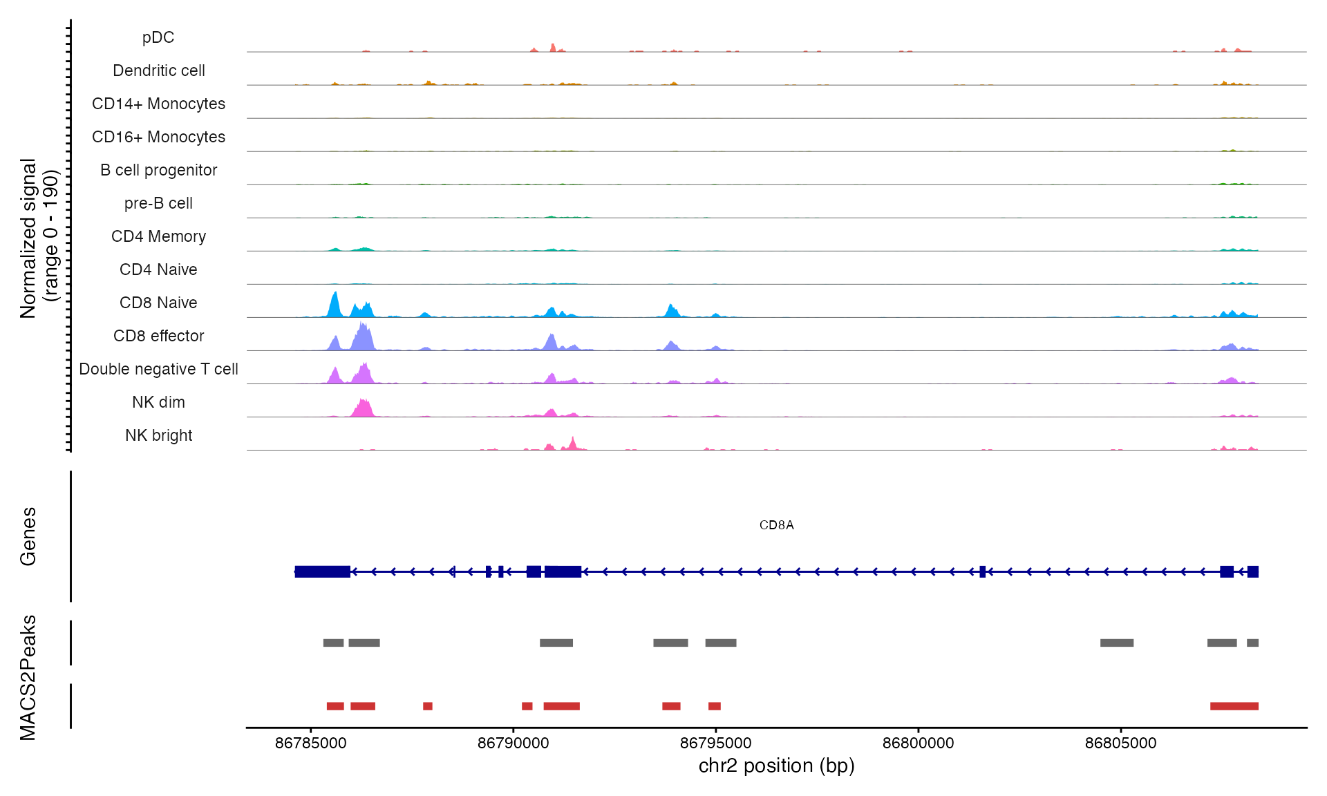 We can visualize the cell-type-specific MACS2 peak calls alongside