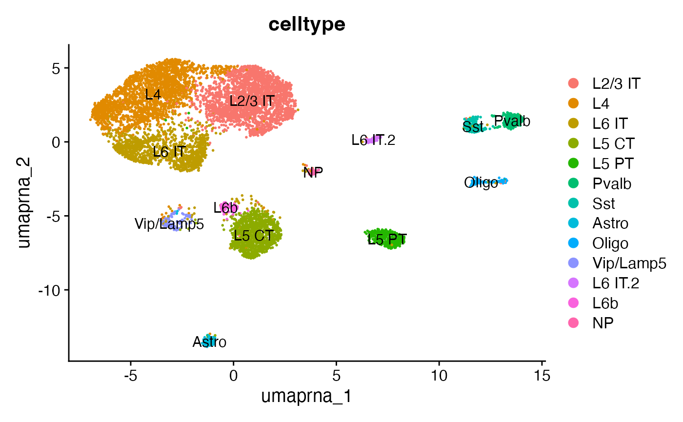 Next we can annotate cell types in the dataset by transferring labels from an existing scRNA-seq dataset for the adult mouse brain, produced by the Allen Institute.