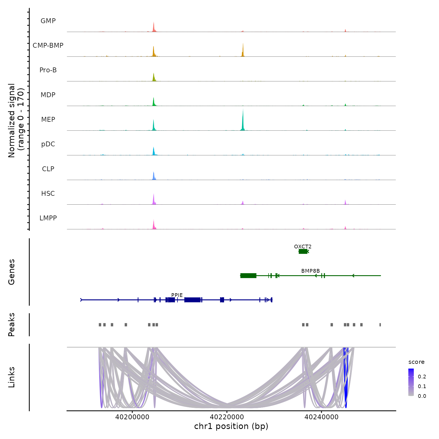 CoveragePlot(bone, region = "chr1:40189344-40252549", links = "cicero")