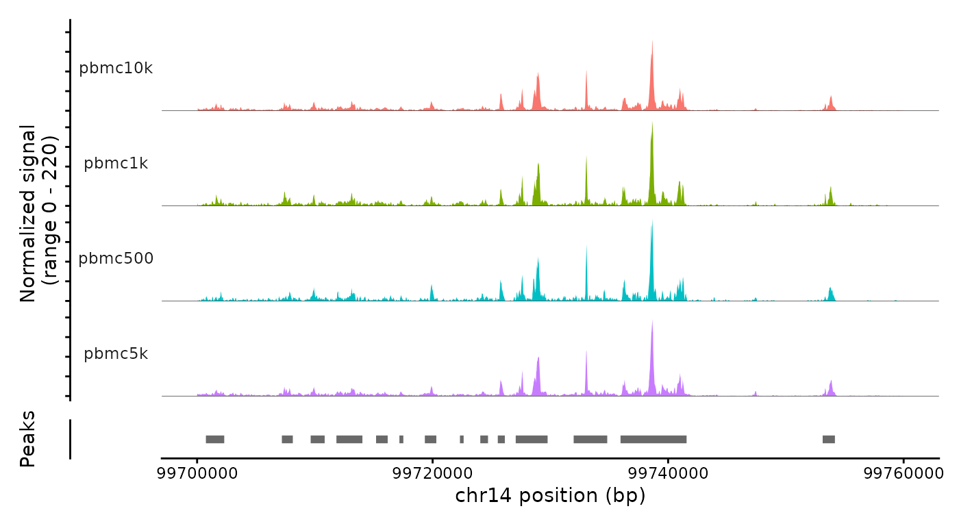 wget https://cf.10xgenomics.com/samples/cell-atac/1.1.0/atac_pbmc_10k_nextgem/atac_pbmc_10k_nextgem_filtered_peak_bc_matrix.h5When merging multiple single-cell chromatin datasets, it’s important to be aware that if peak calling was performed on each dataset independently, the peaks are unlikely to be exactly the same. We therefore need to create a common set of peaks across all the datasets to be merged.