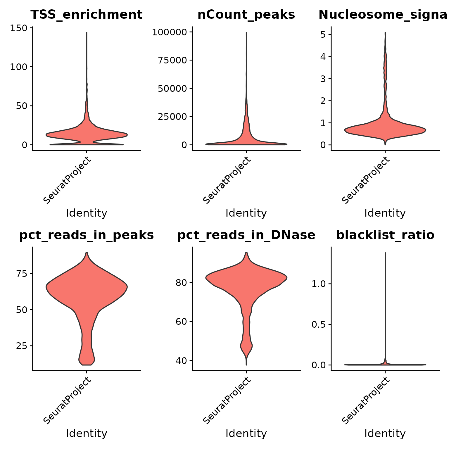 VlnPlot(crc, c("TSS_enrichment", "nCount_peaks", "Nucleosome_signal", "pct_reads_in_peaks", "pct_reads_in_DNase", "blacklist_ratio"), pt.size = 0, ncol = 3)