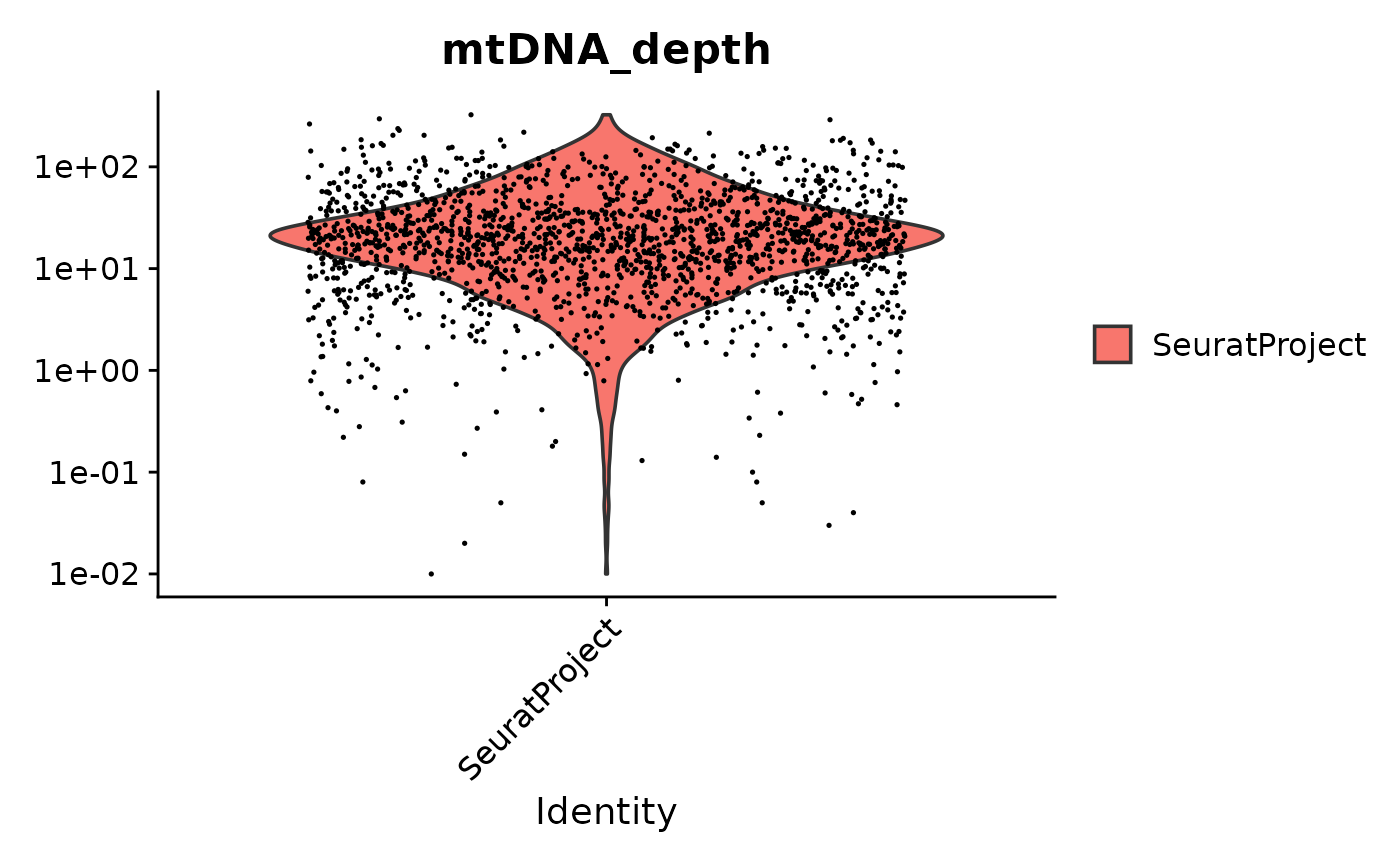 crc <- AddMetaData(crc, metadata = mito.data$depth[Cells(mito), ], col.name = "mtDNA_depth")We can look at the mitochondrial sequencing depth for each cell, and further subset the cells based on mitochondrial sequencing depth.