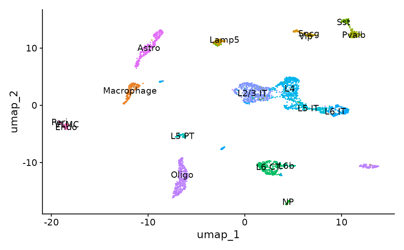 In this demonstration we use data from the adult mouse brain. See our vignette for the code used to generate this object, and links to the raw data. First, load the required packages and the pre-computed Seurat object: