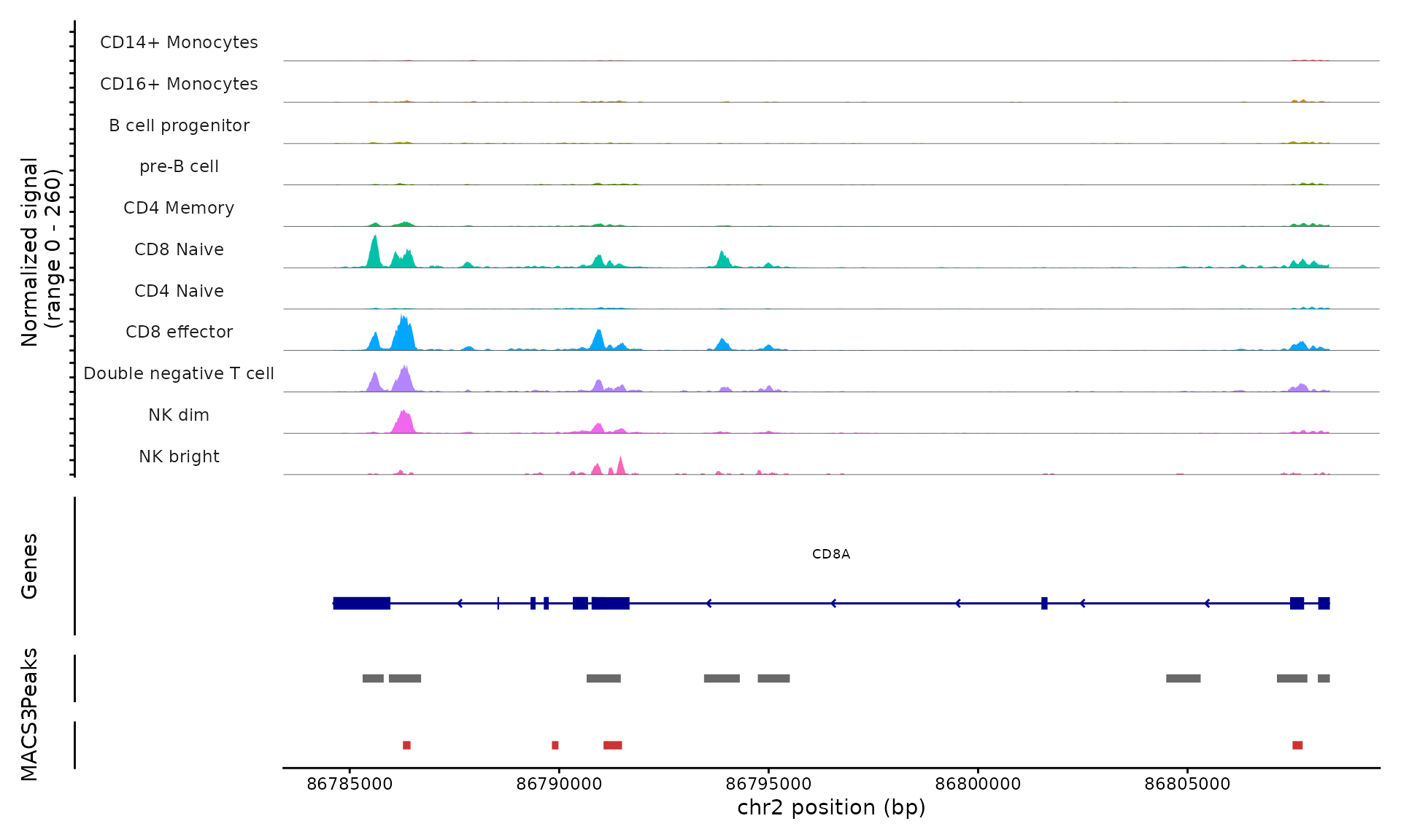 We can visualize the cell-type-specific MACS3 peak calls alongside