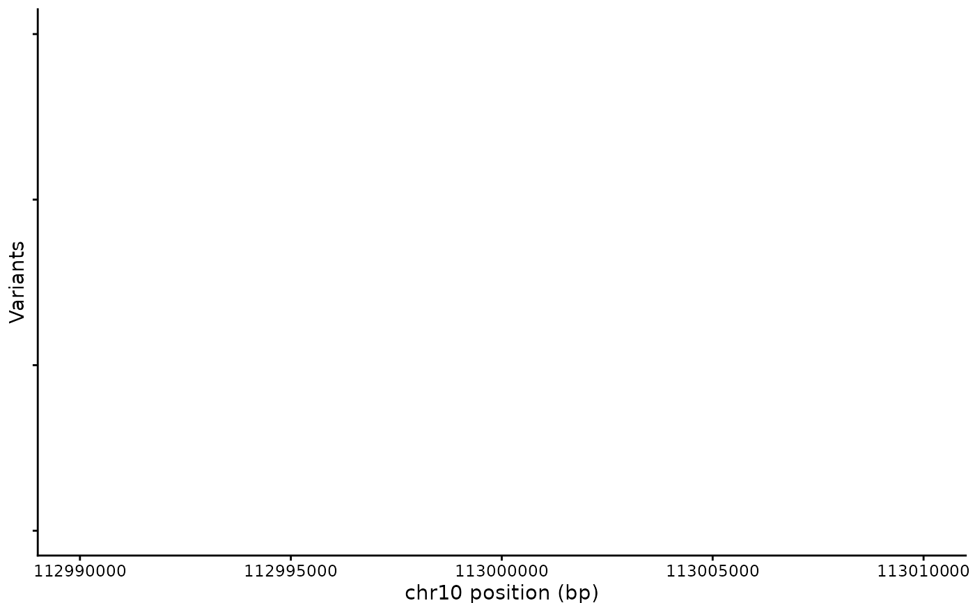 Genomic region (GenomicRanges::GRanges or a string like "chr10:112900000-113100000" that can be converted to